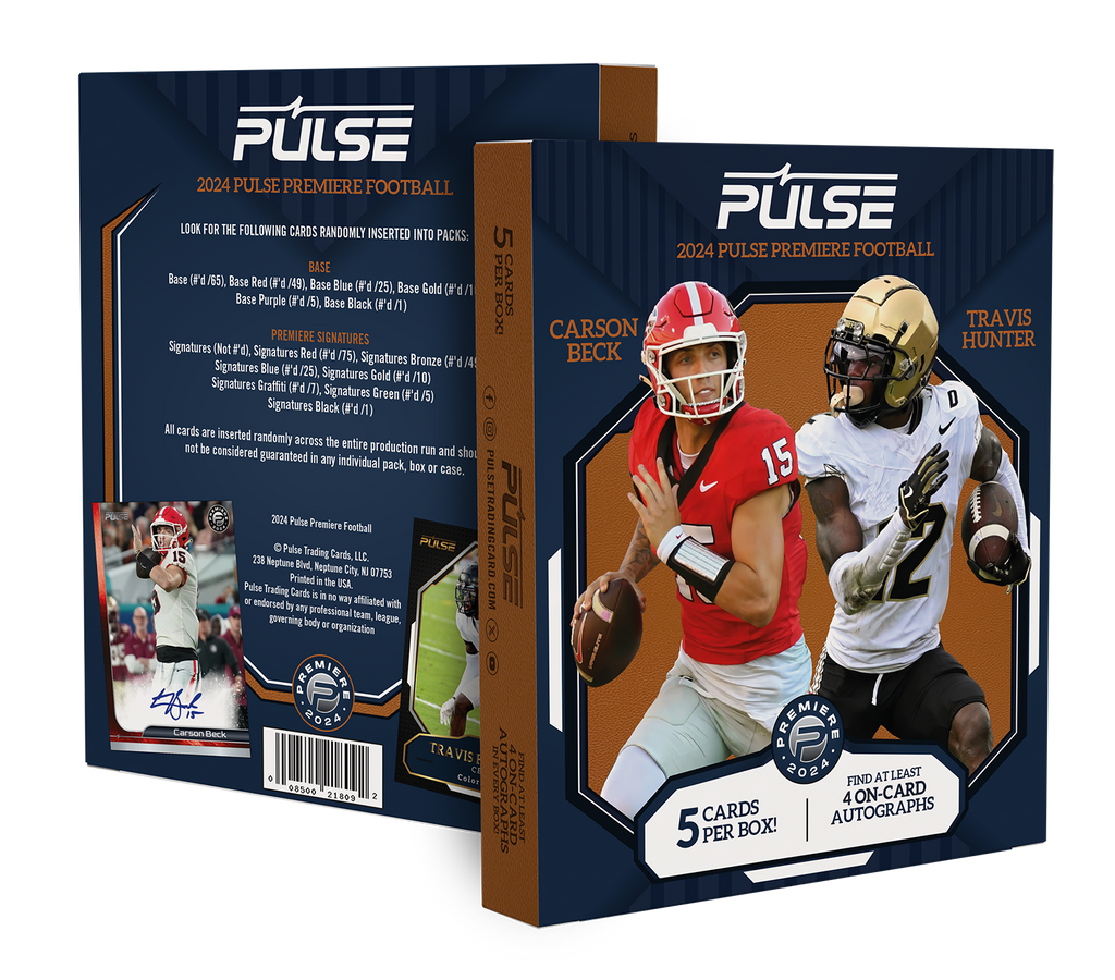 Pulse Trading Cards is excited to announce the debut of Pulse Football! 2024 Pulse Premiere Football features autographs from some of the game's brightest future stars. Every box delivers at least four ON - CARD Autographs. Look for future top picks like Carson Beck, Nico Iamaleava, Travis Hunter and more! Find low-numbered on-card autographs of top prospects. HOBBY EXCLUSIVES: Look for the stunning Graffiti autograph parallel #'d/7 and Black #'d/1. Find hot boxes that contain additional autographs!