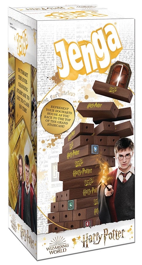 Climb toppling heights, scaling the Grand Staircase in this magical version of the classic stacking game! JENGA: Harry Potter lets players represent their favorite Hogwarts house as the first student to reach the classroom door! Brave unpredictable challenges of removing and replacing blocks based on every roll of a custom die.