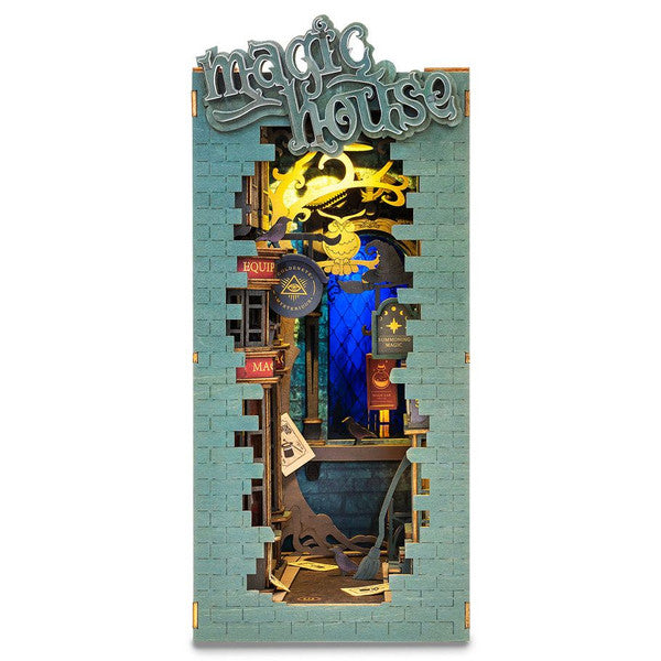 Magic House is a Book Nook Book End is a DIY bookshelf decoration in form of a mysterious magic alley DIY miniature house that only those who can do magic can enter. Use your hands to assemble all the house parts to decorate your bookshelf as a book nook insert. The included warm touch light can illuminate your bookshelf even at night!