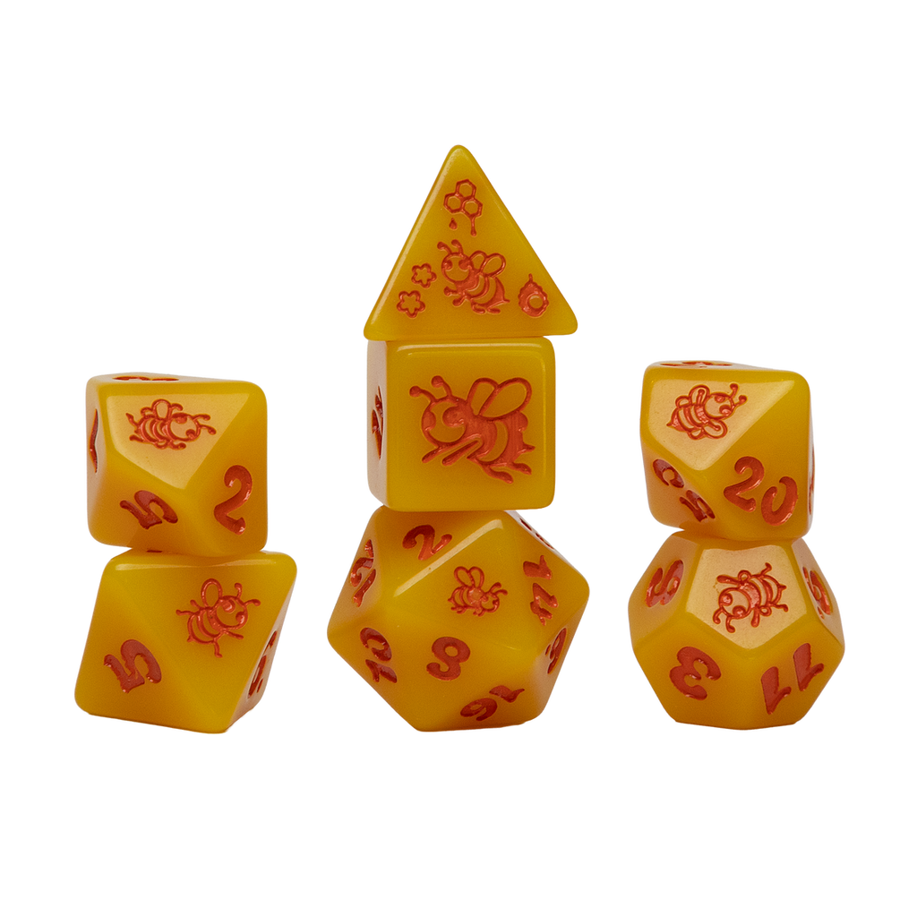Swarm into action with Golden Buzz! This vibrant yellow polyhedral dice set features bold red ink numbering that pops like a bee's stripes. Watch your rolls glow with honeyed warmth while crisp red numbers ensure every result is crystal clear. Perfect for players who want their dice to buzz with personality and visibility. These dice are ready to guide your adventures with sunny charm and nature-inspired flair. Roll with the hive mind and let luck take flight!
