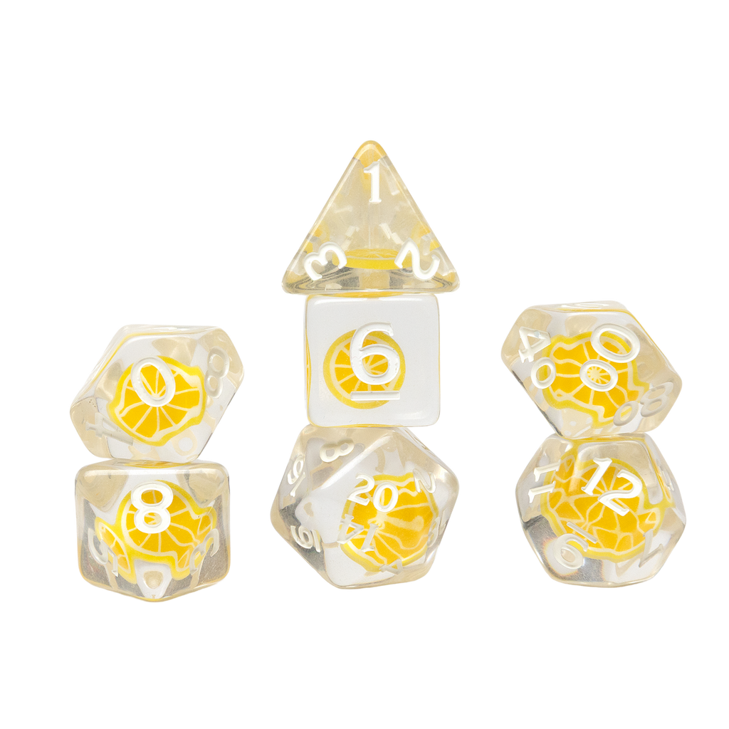 Zesty, sharp, and refreshing—the Lemon Slice Dice Set adds a citrus twist to your rolls. This 7-piece set features a bright lemon slice sealed within, bringing a burst of yellow sunshine to your tabletop games. Collect it alongside four other fruity designs in the Fruit Slice Dice series!