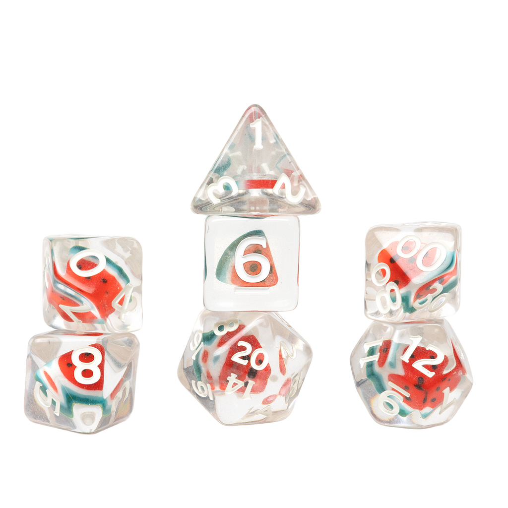 Fresh, vibrant, and full of summer vibes—the Watermelon Slice Dice Set brings a crisp sweetness to your rolls. This 7-piece set features a juicy watermelon slice sealed within, adding a bold splash of red and green to your tabletop adventures. Collect it alongside four other fruity designs in the Fruit Slice Dice series!