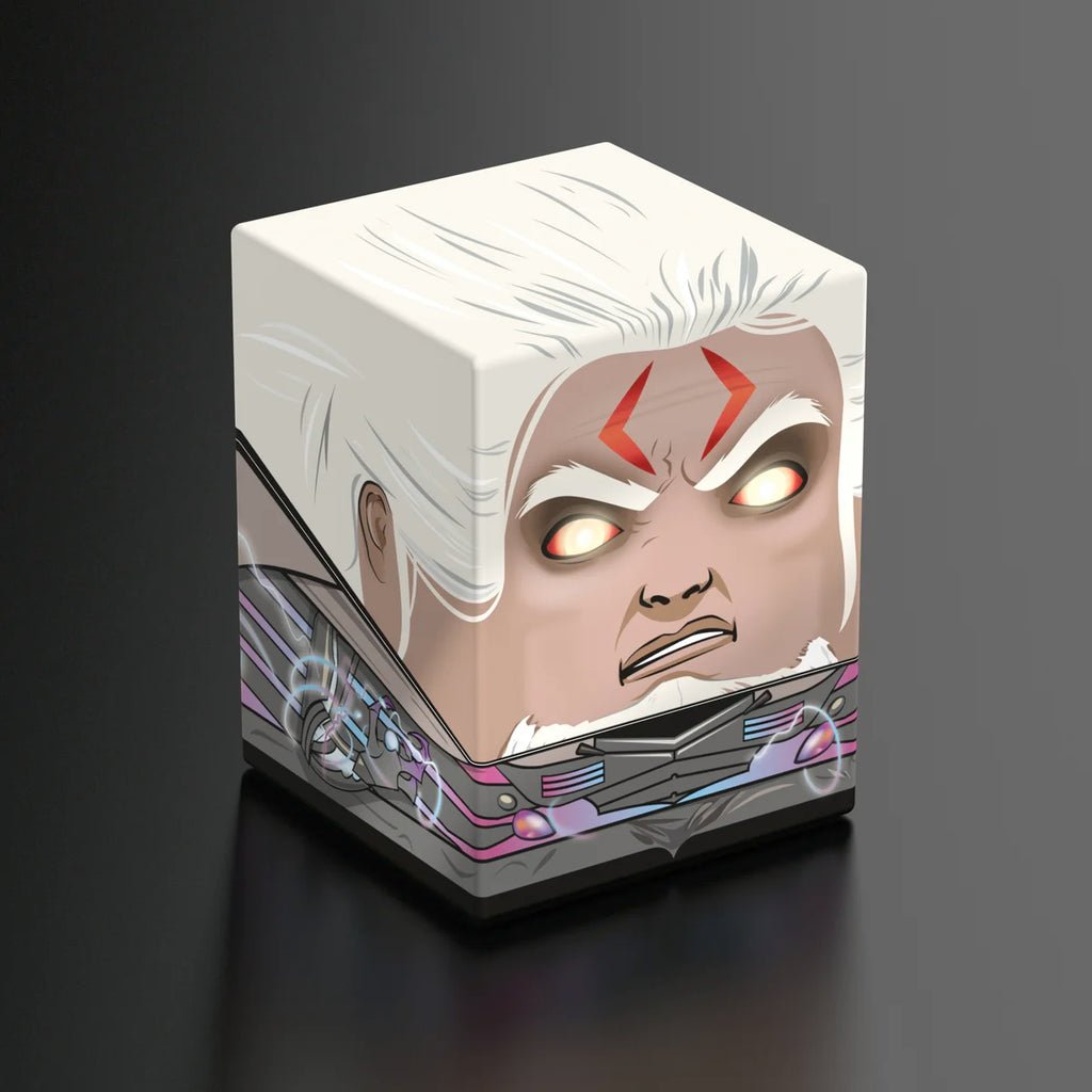 Collectible box for storing your deck, tabletop gaming accessories, and/or collectibles. The Tezzeret Squaroe from the Magic: The Gathering edition holds up to 100 cards in double protective sleeves if used as a deck box. Squaroes are made from 78% renewable recources.