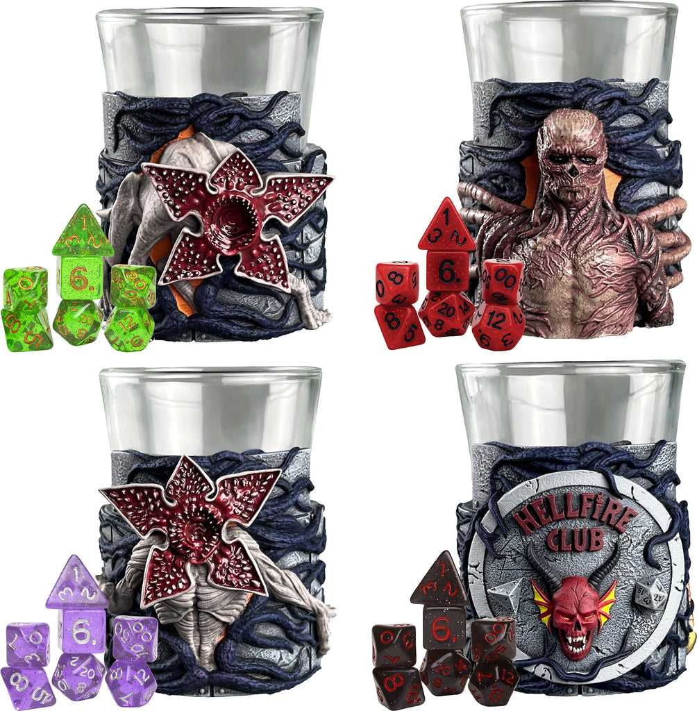 Bring the Upside Down to your gaming table with Stranger Things Mini Dice Cups- a must-havefor RPG fans and Stranger Things collectors alike. Made from glass and featuring detailed sculpts of iconic creatures and themes from the hit Netflix series, these mini dice cups combine style, function, and fandom.Each cup comes paired with a complete 8-piece mini polyhedral dice set, perfect for your favorite tabletop RPG. Inside, you'll find:d4 x 1d6 x 1d8 x 1d10 x 1d12 x 1d% x 1d20 x 2Choose from four collectible designs- Vecna, Demogorgon, Demodog (plus Dart), and the Hellfire Club logo- or collect them all to complete your Hawkins-themed set. Whether you're rolling for initiative or displaying them on your shelf, these dice cups are the perfect blend of function and fandom.