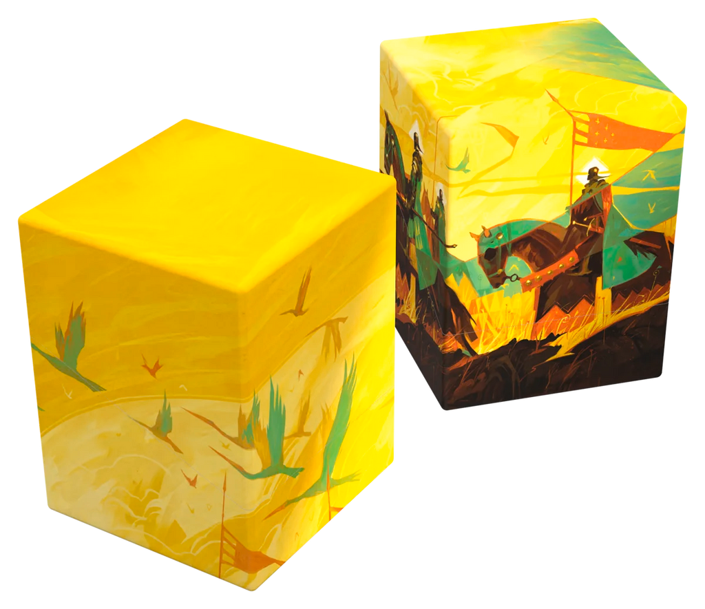 Ultimate Guard's RTE Boulder 100+ deck boxes are durable, reliable, and made in Germany from 78% renewable resources. Despite their secure closure, they remain easy and convenient to open. Each deck box holds 100 double-sleeved cards in Ultimate Guard sleeves*, making them an ideal choice for trading card games like Magic: The Gathering, Pokémon, Lorcana, Flesh and Blood, Yu-Gi-Oh!, and One Piece. The Artist Edition #3, designed by Magic: The Gathering artist Dominik Mayer, includes two RTE Boulder 100+ deck boxes that combine to reveal the full artwork.