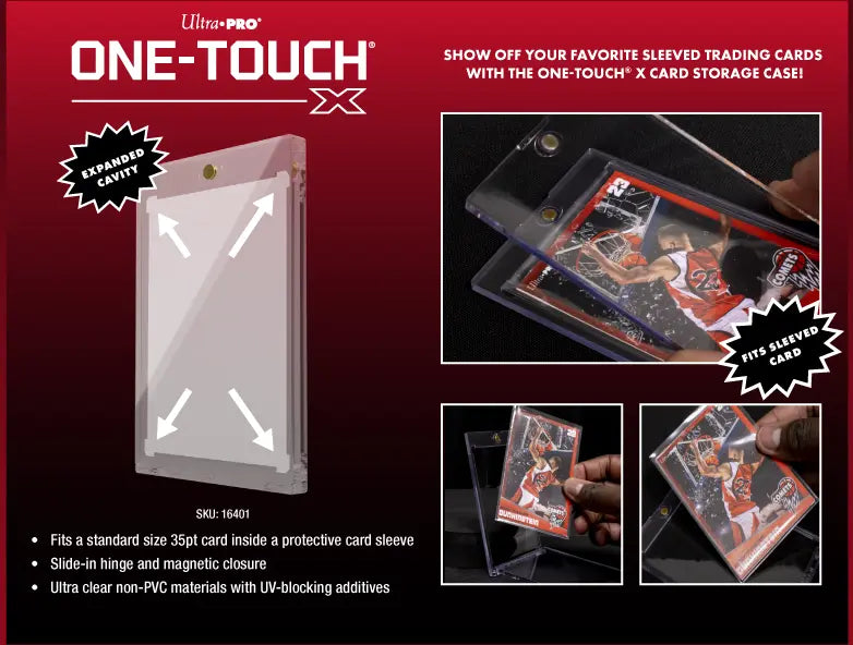 ONE-TOUCH X Magnetic Card Holder for Sleeved Cards- Show off your favorite sleeved trading cards with the ONE-TOUCH X card storage case! Designed as the final destination for your collectible trading cards, the ONE-TOUCH X features a bigger inner cavity to hold a standard size collectible card of 35pt in thickness inside a protective sleeve (up to Platinum Sleeve Size #15221), so you never have to remove your collectible card from its protective sleeve to display it. Every holder uses UV blocking additives to protect cards from harmful UV-rays, and is made with non-PVC materials to provide acid-free protection - ensuring your valuable hit retains its condition while under display.